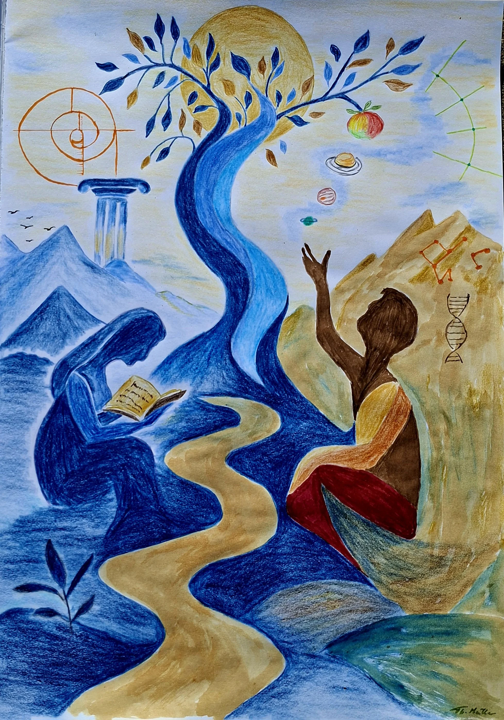 Offenbar ist es das, dieses “Gott-gleich-Werden”, auf Augenhöhe mit dem Schöpfer kommen. Es ging noch nie gut, weil wir dafür nicht bestimmt sind. Trotzdem scheint es in uns angelegt zu sein, dieses “Streben nach Erkenntnis”. Ich hab es in diesem Bild vereint. Das Bild soll die ganze Spannbreite der menschlichen Erkenntnissuche zeigen. Von der antiken Weisheit (Säule, lesende Frau) über die biblische “Vertreibung ins Wissen” (Apfel) bis hin zur heutigen Forschung (Genetik, Astronomie) ist alles skizziert.